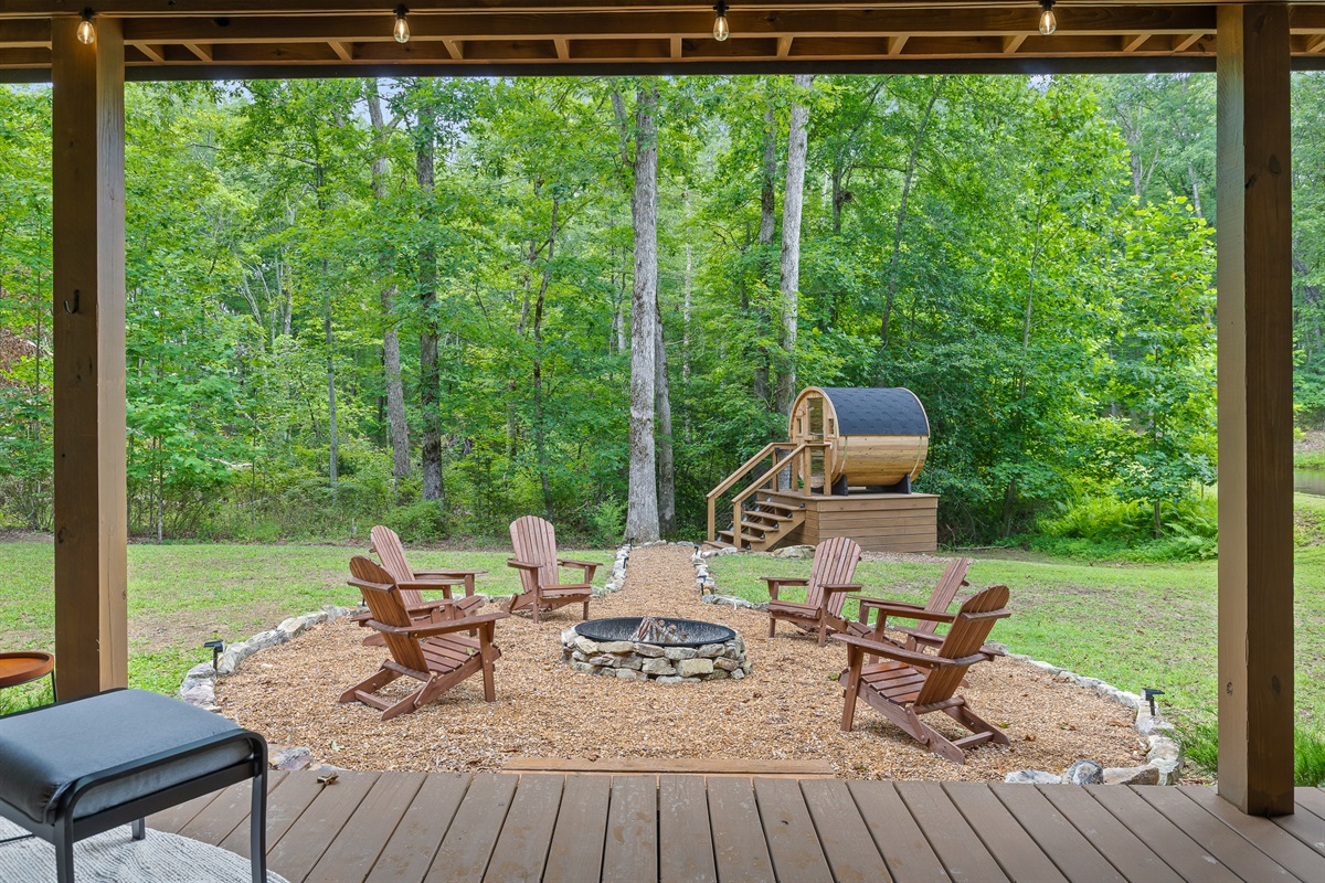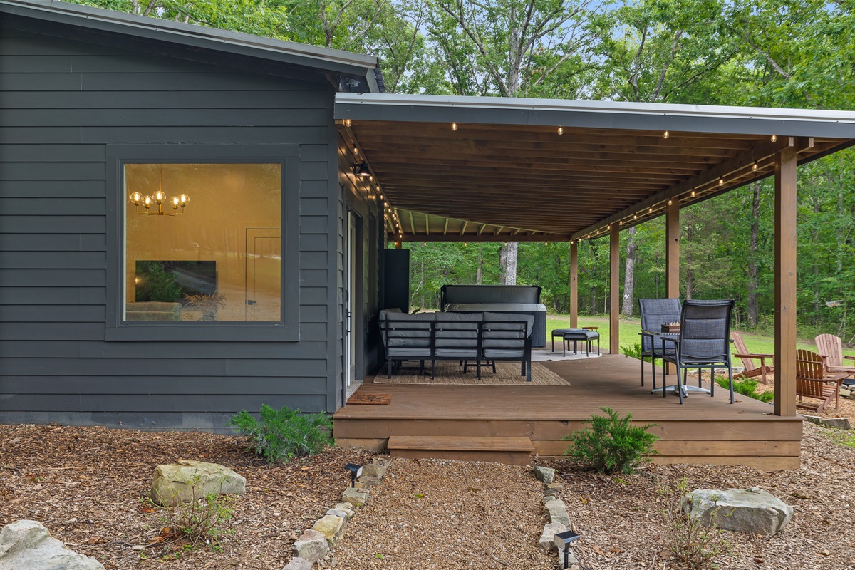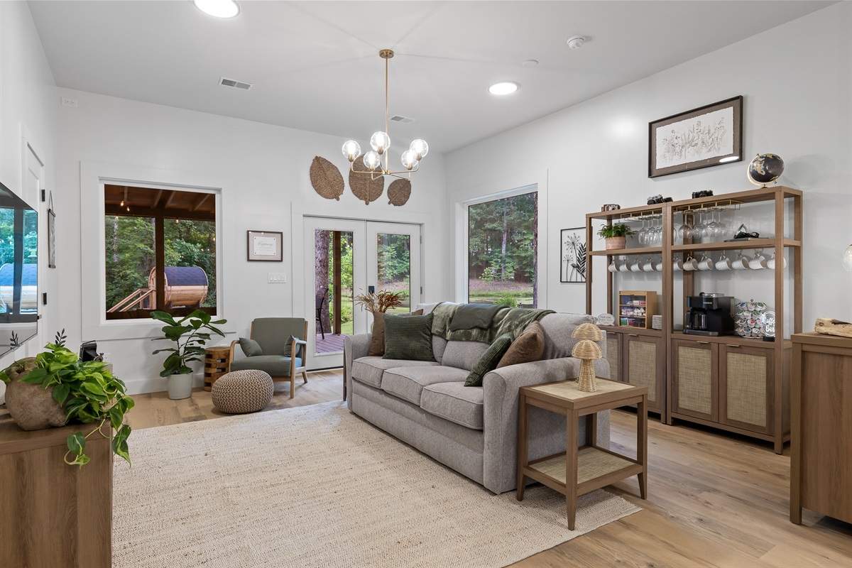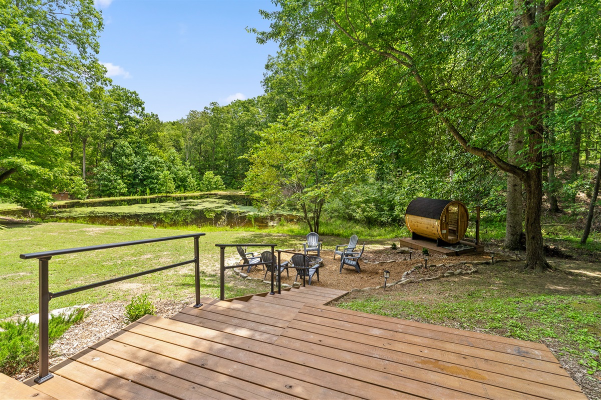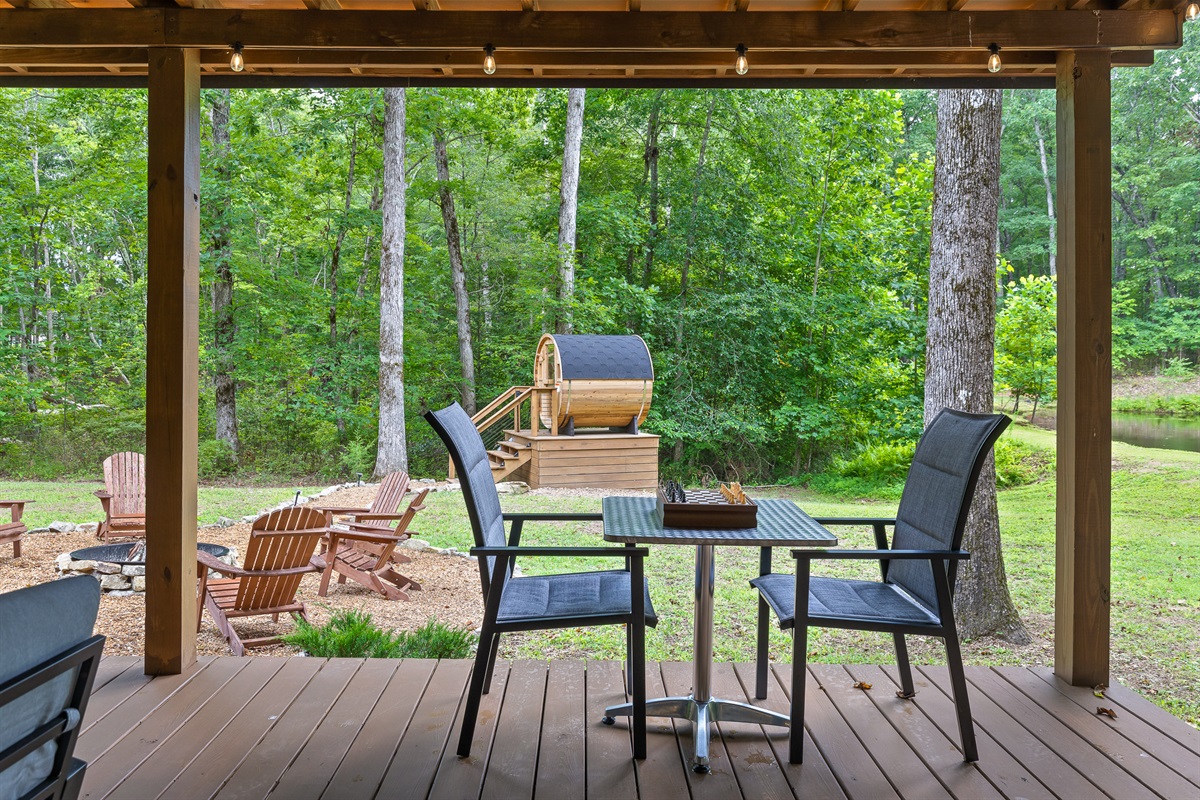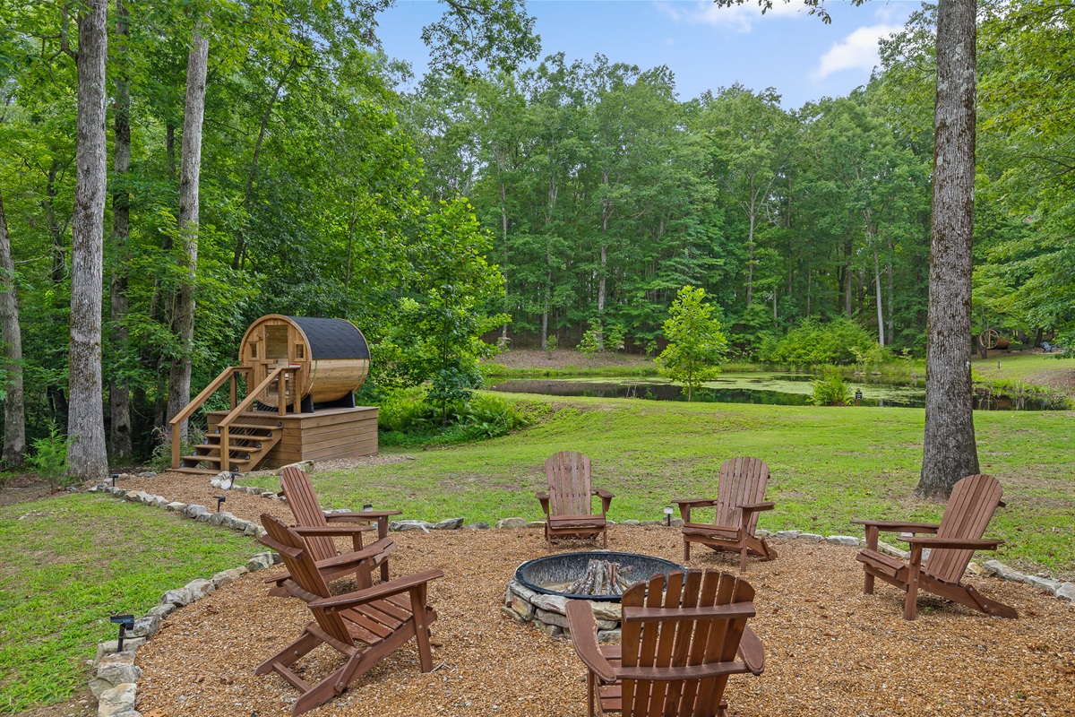 Escape to Little Moments, a tranquil tiny home tucked into the woods just 10 minutes from the University of the South. Set beside a serene pond and surrounded by towering trees, this private retreat blends comfort, nature, and a touch of luxury. Inside, the home comfortably sleeps up to 6 guests with king bed, a cozy queen sleeper sofa, and twin bunk beds—perfect for families, couples, or small groups. The fully equipped kitchen is ready for home-cooked meals, and large windows fill the space with natural light and forest views. Step onto the spacious covered porch to grill dinner, gather at the outdoor dining table, or simply listen to the sounds of nature. End your day soaking in the covered hot tub (seats 6), unwinding in the private steam sauna, or refreshing in the outdoor shower after a hike or campus visit. Whether you’re exploring Sewanee, attending a special event, or seeking a peaceful escape, Little Moments offers the perfect setting to relax, recharge, and make memories.