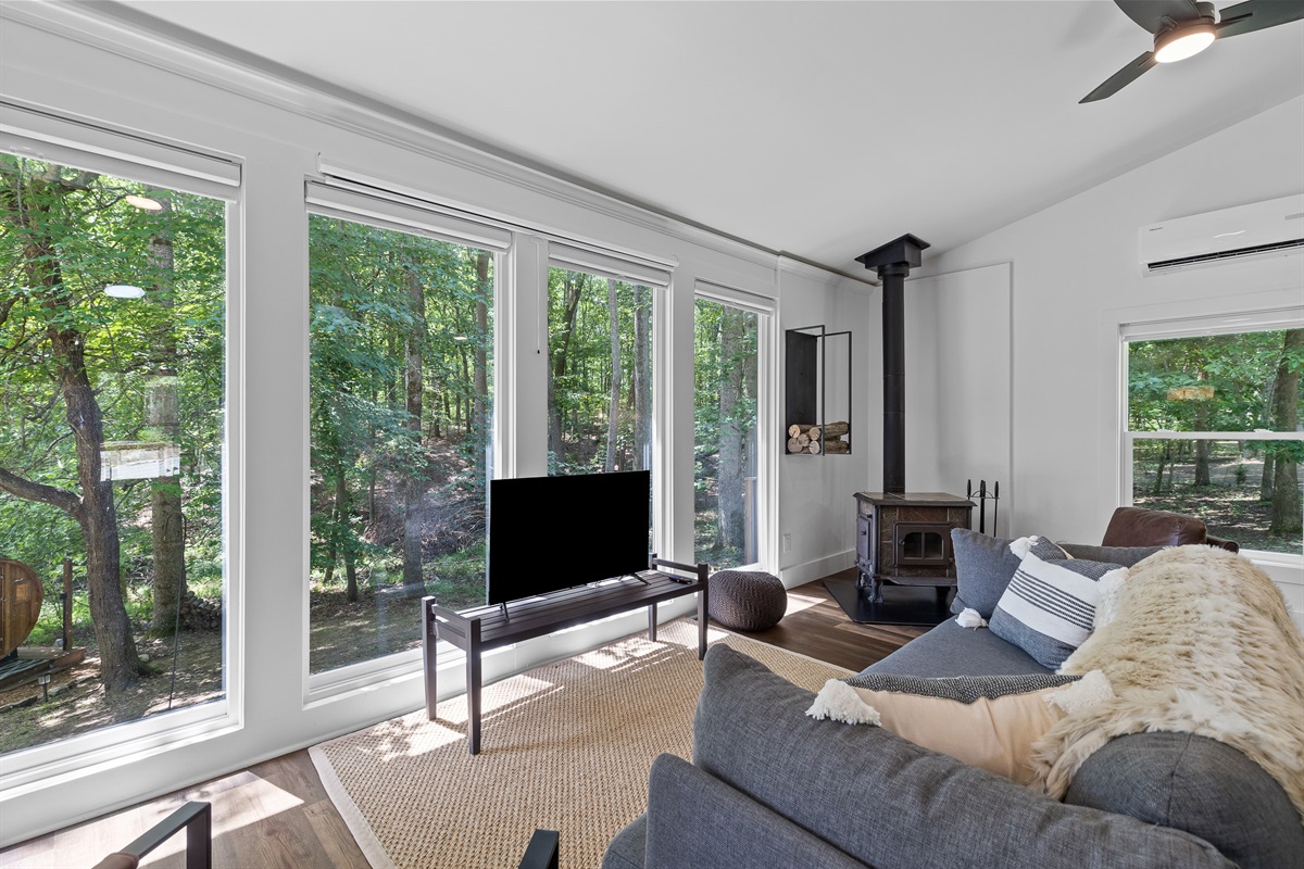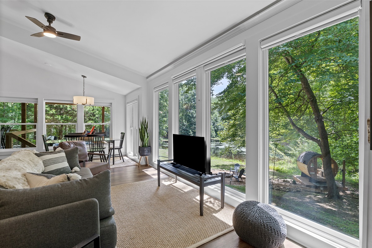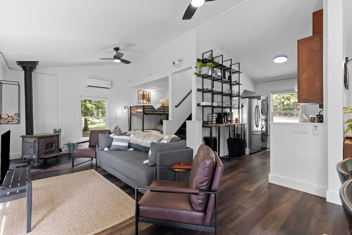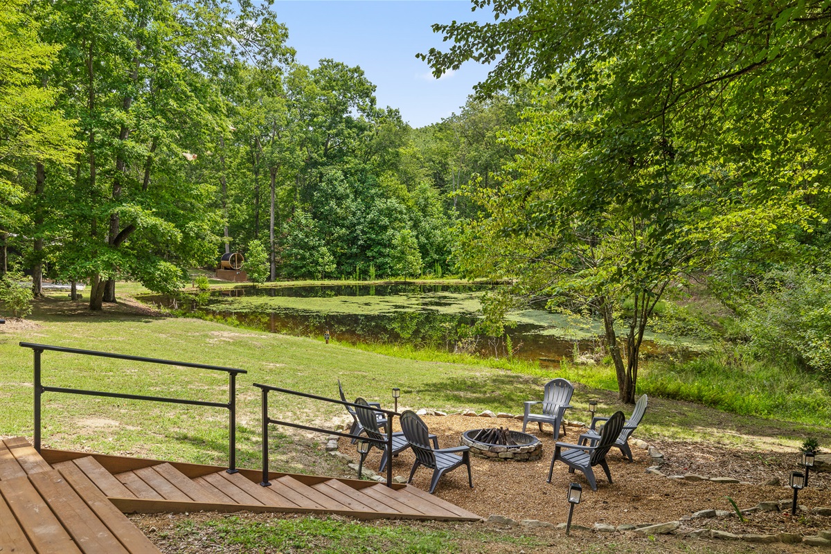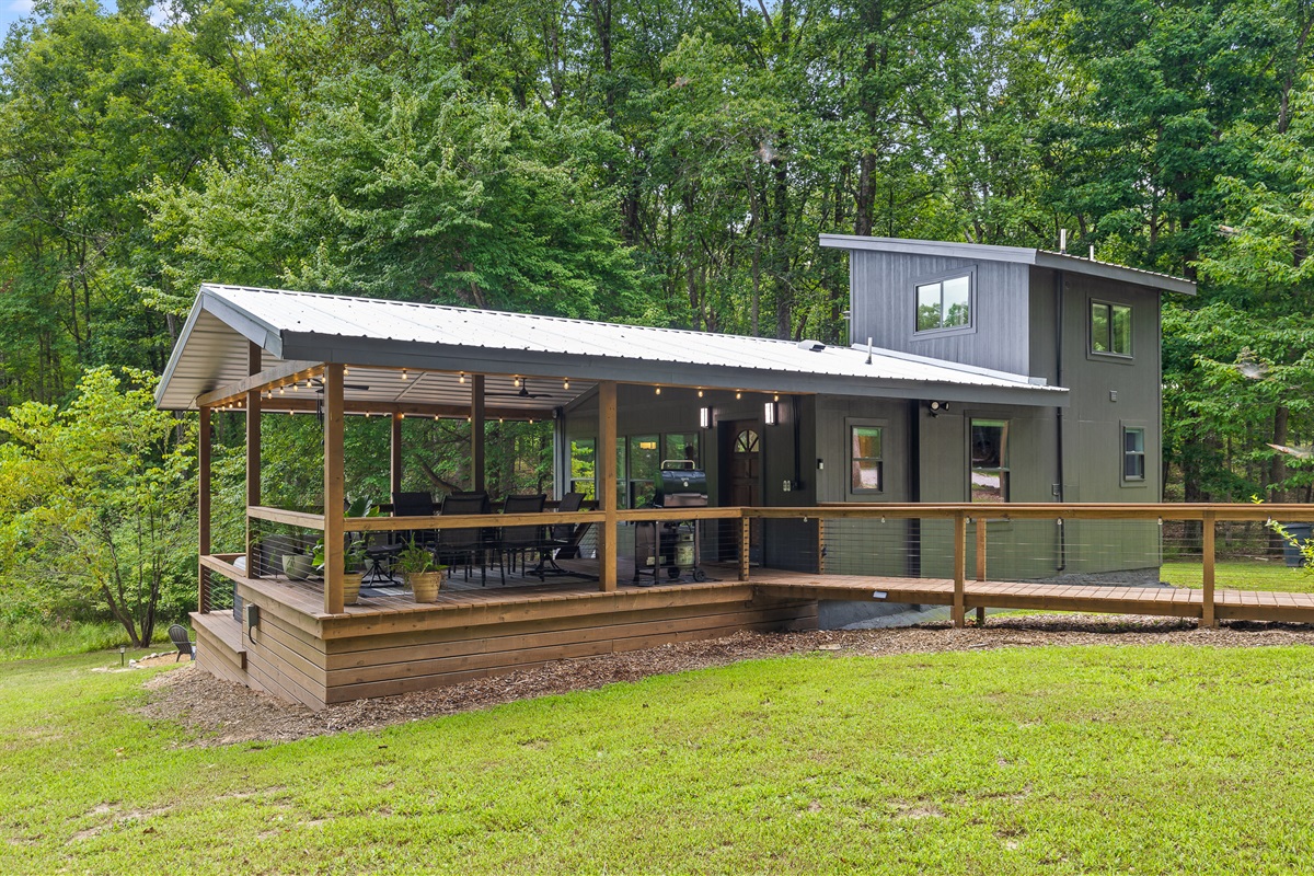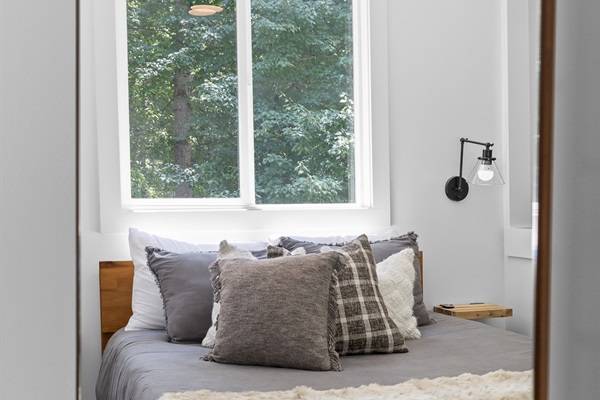 Escape to Little Moments, a tranquil tiny home tucked into the woods just 10 minutes from the University of the South. Set beside a serene pond and surrounded by towering trees, this private retreat blends comfort, nature, and a touch of luxury. Inside, the home comfortably sleeps up to 6 guests with king bed, a cozy queen sleeper sofa, and twin bunk beds—perfect for families, couples, or small groups. The fully equipped kitchen is ready for home-cooked meals, and large windows fill the space with natural light and forest views. Step onto the spacious covered porch to grill dinner, gather at the outdoor dining table, or simply listen to the sounds of nature. End your day soaking in the covered hot tub (seats 6), unwinding in the private steam sauna, or refreshing in the outdoor shower after a hike or campus visit. Whether you’re exploring Sewanee, attending a special event, or seeking a peaceful escape, Little Moments offers the perfect setting to relax, recharge, and make memories.