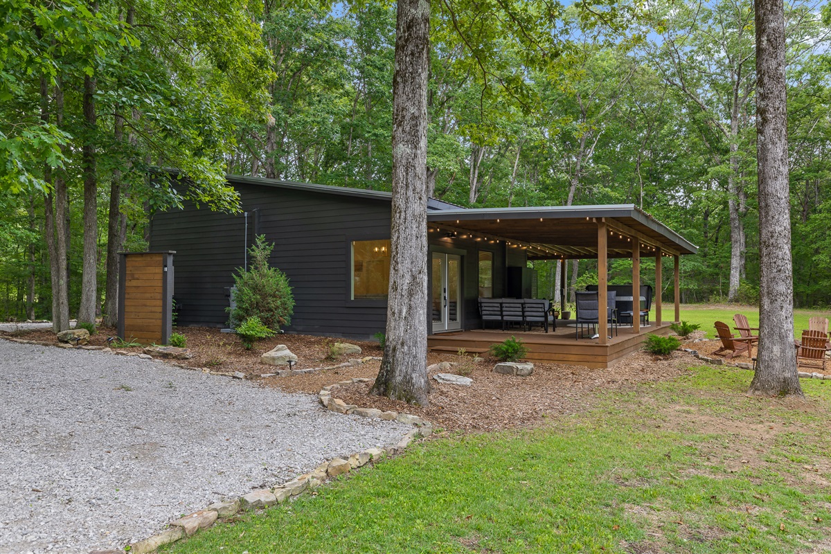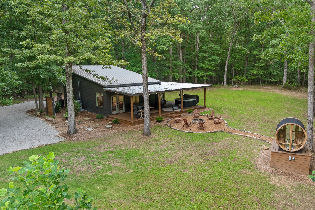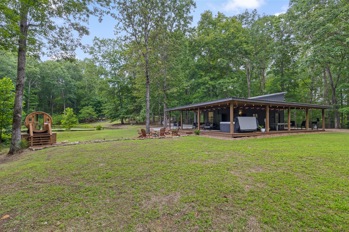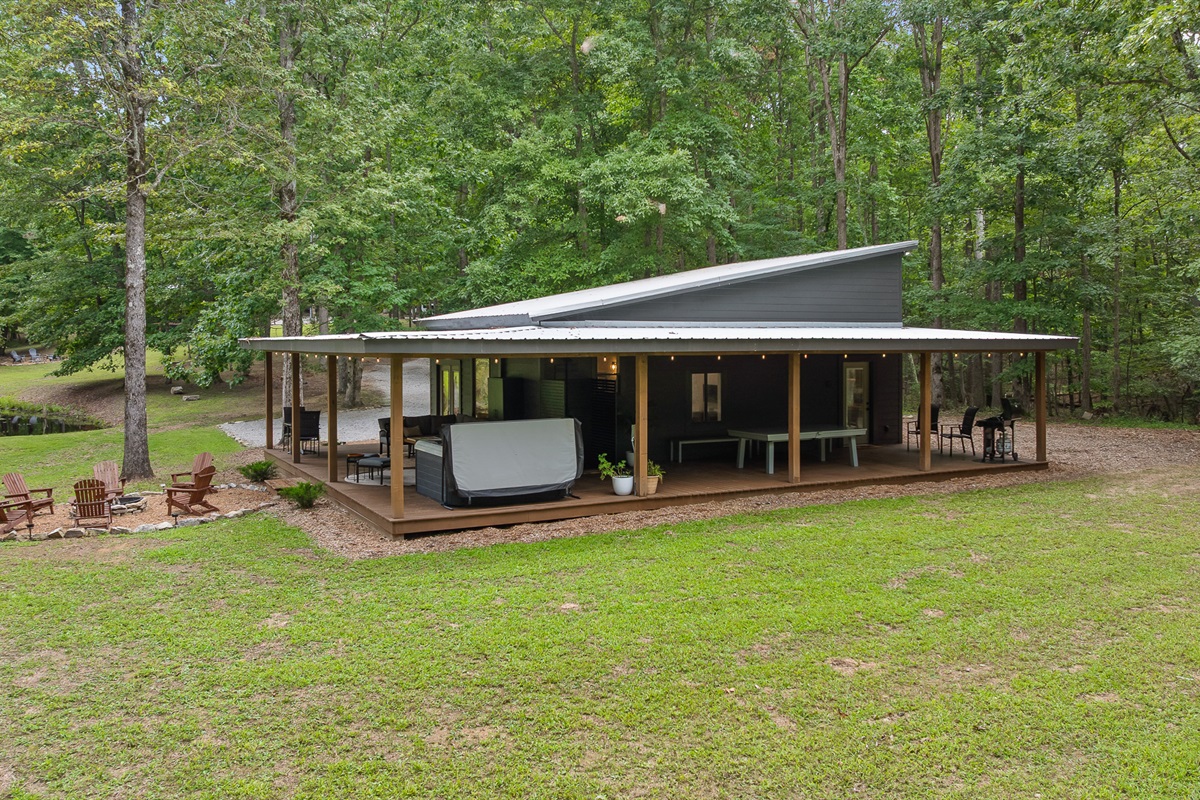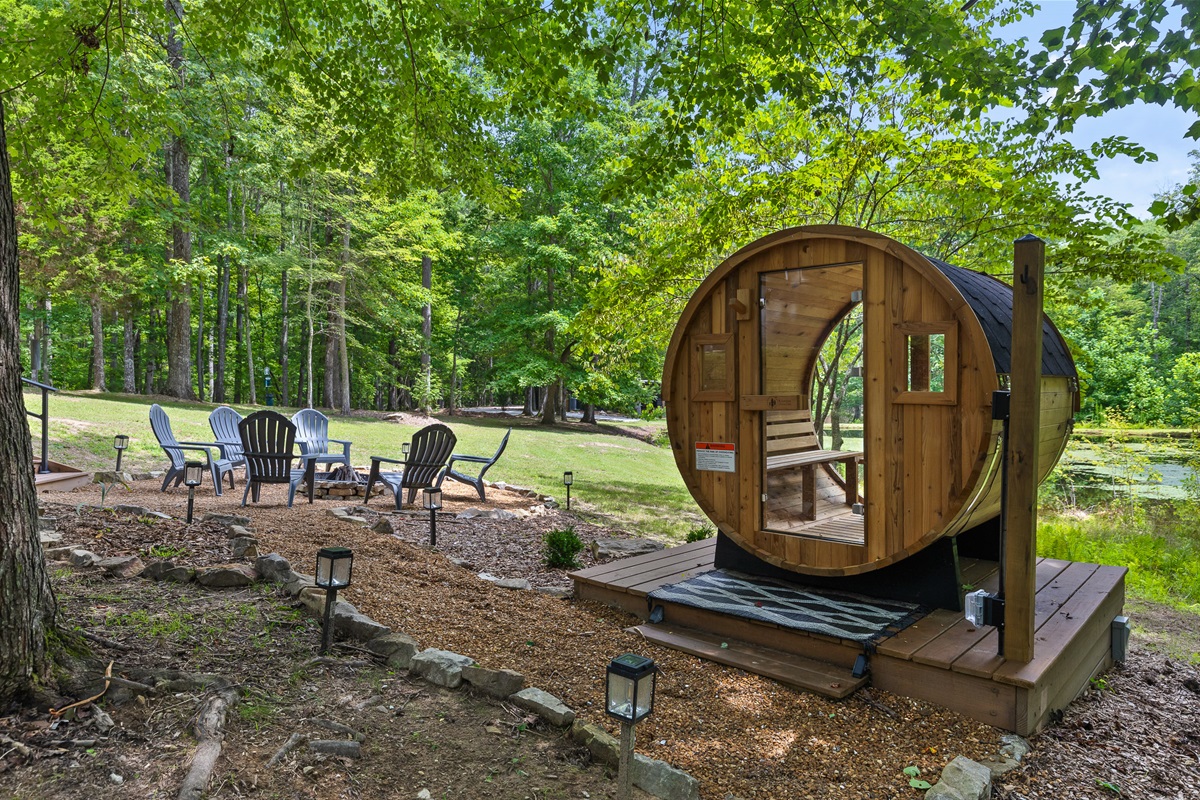 Escape to this serene tiny home tucked away in the woods just 10 minutes from the University of the South. Surrounded by trees and nestled beside a peaceful pond, this private retreat offers the perfect blend of comfort, nature, and relaxation. Inside, the home sleeps up to 6 guests with a private queen bedroom, a cozy queen sleeper sofa, and twin bunk beds—ideal for families, couples, or small groups. The fully equipped kitchen has everything you need to cook and dine in, while large windows bring in natural light and forest views. Step outside to a spacious covered porch featuring a gas grill and outdoor dining table—perfect for enjoying your meals al fresco. Unwind in the covered hot tub (seats 6), rejuvenate in the private steam sauna, or refresh in the outdoor shower after a day of hiking or exploring campus. Whether you're visiting Sewanee, attending a nearby event, or simply craving a peaceful getaway, this wooded retreat offers comfort, privacy, and a touch of luxury.